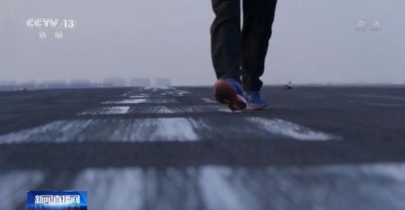 總臺央視記者李寧:這個就是在陸地上來模擬航母艦載機著陸的平臺。我們在這個地方呆了兩天,直到今天日落黃昏,才終于有機會走上這個平臺。因為它艦載機訓練的頻次非常頻繁,我們只有在訓練的間歇,才有機會帶大家來看一下。這里都是黑黢黢的一片,所以這個地方就叫做黑區(qū)。這一道道胎印就見證著這支艦載機部隊從無到有,一步步成長的過程。