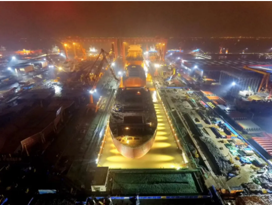 ——第二次改造,2018年10月至2020年6月,再次接長(zhǎng)200米,建成后總長(zhǎng)達(dá)740米。通過中間塢門分別形成前后兩個(gè)獨(dú)立塢室,以滿足年產(chǎn)1.5艘大型郵輪及3艘VLCC綱領(lǐng)產(chǎn)品要求。