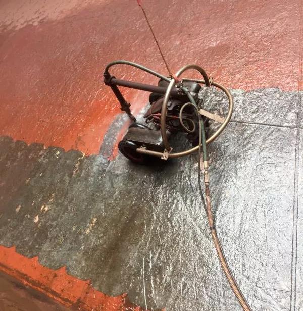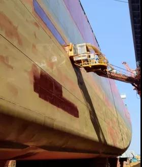 2020年,公司在水霧噴砂基礎(chǔ)上引進了8套超高壓水除銹設(shè)備,并通過引進技術(shù)自主研發(fā)爬壁機器人,進一步壓減修船除銹粉塵的產(chǎn)生量,從根源上解決了船舶除銹帶來的揚塵問題。