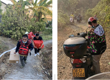 在重慶40多度的高溫天氣下,他們有的為當地捐贈礦泉水和食物等物資;有的加入挖隔離帶的隊伍中;有的在后方將物資運送到統一堆放點;山勢陡峭,有的則是成為“摩托幫”,將物資送到最前線。