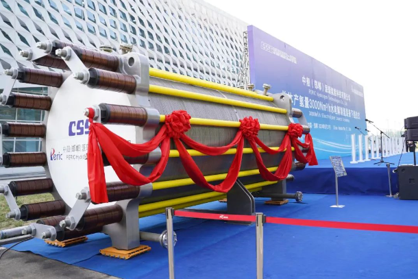 該裝備圍繞我國氫能高質量發展重大需求,突破了大功率、高電密、寬負載、低電耗等多項前沿技術,實現了單體產氫量由2000Nm3/h到3000Nm3/h的跨越,運行電流密度提升17%,槽體重量降低13%,制氫系統具備30%-110%的動態調節能力,能耗達到國標一級能效標準,可顯著提高單機產能、降低生產投入和運行成本,為大規模綠氫制取提供了創新型解決方案。