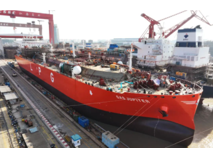 2月15日,在4號塢率先出塢的是江南造船為廣東九豐能源集團有限公司建造的國內首制79800立方米Mark III型薄膜式液化天然氣(LNG)運輸船,以及為天津西南海運有限公司建造的93000立方米超大型液化氣船(VLGC)首制船;同時起浮的還有93000立方米VLGC后續半船和即將移位至3號塢的24100TEU超大型集裝箱船的艏部巨型環段。同批次的后續作業將轉移到3號塢,預計在2月24日,江南造船為地中海航運(MSC)建造的24100TEU超大型集裝箱船系列第二艘(H2733船)以及為新加坡Petredec公司建造的93000立方米VLGC系列第二艘(H2736船)出塢,后續兩艘半船同步起浮。