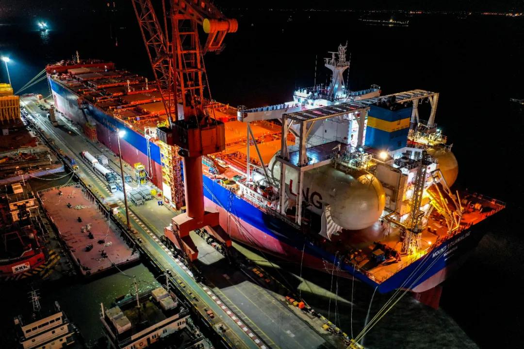1月28日,中國船舶集團(tuán)旗下外高橋造船自主研發(fā),攜手中船貿(mào)易,為新加坡EPS公司建造的全球首艘液化天然氣(LNG)雙燃料動力20.9萬載重噸紐卡斯?fàn)栃蜕⒇洿?