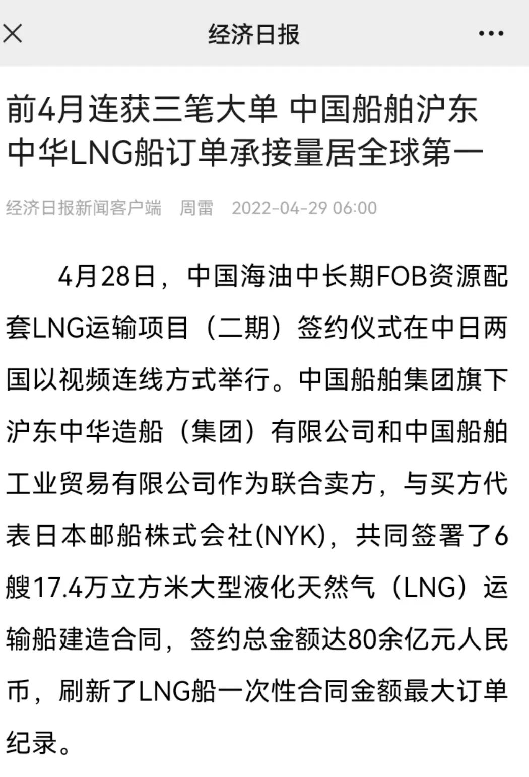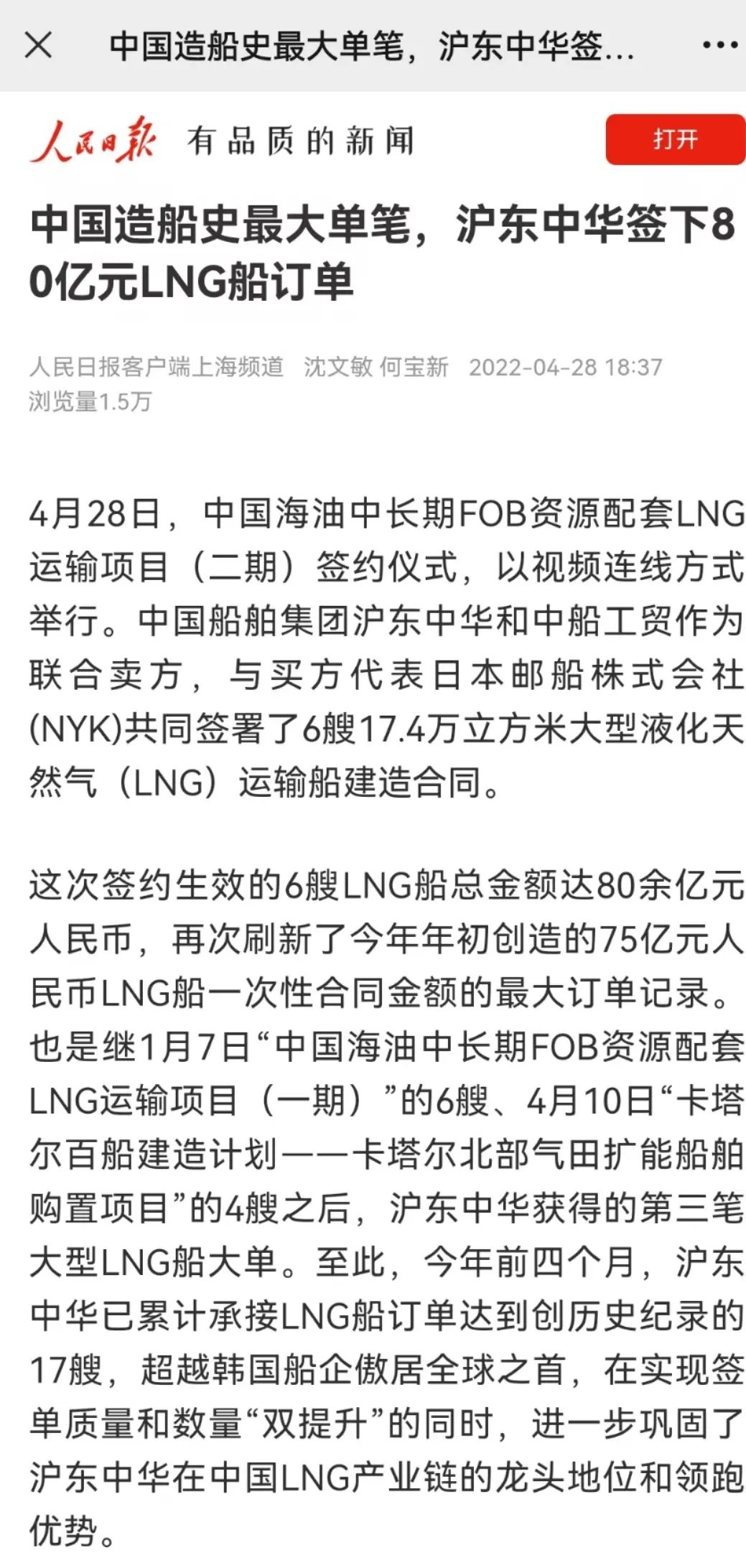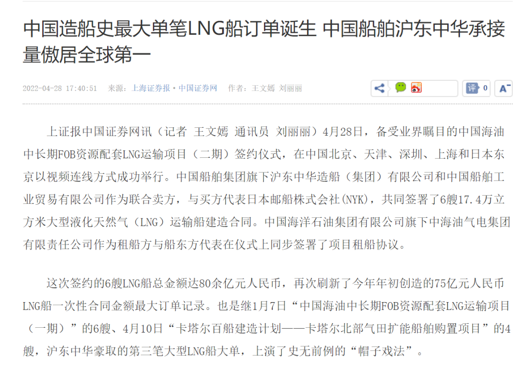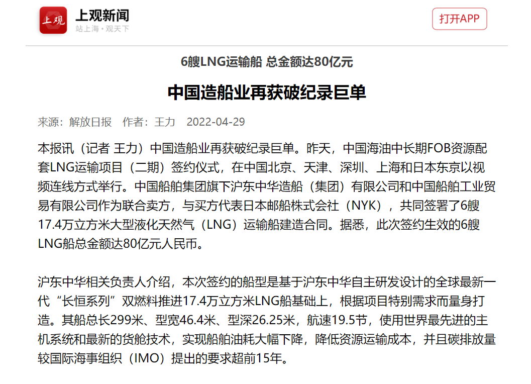 這次簽約生效的6艘LNG船總金額達(dá)80余億元人民幣,再次刷新了今年年初創(chuàng)造的LNG船一次性合同金額最大訂單紀(jì)錄。至此,今年前4個(gè)月滬東中華已累計(jì)承接LNG船訂單達(dá)到創(chuàng)歷史紀(jì)錄的17艘,超越韓國(guó)船企傲居全球之首,在實(shí)現(xiàn)簽單質(zhì)量和數(shù)量“雙提升”的同時(shí),進(jìn)一步鞏固了滬東中華在中國(guó)LNG產(chǎn)業(yè)鏈的龍頭地位和領(lǐng)跑優(yōu)勢(shì)。