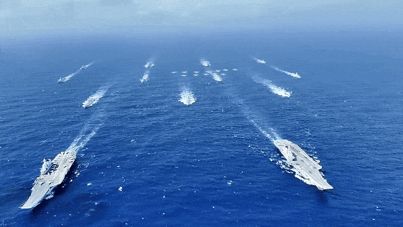 在南海某海域,遼寧艦、山東艦編隊首次開展雙航母編隊演練,錘煉提升航母編隊體系作戰(zhàn)能力